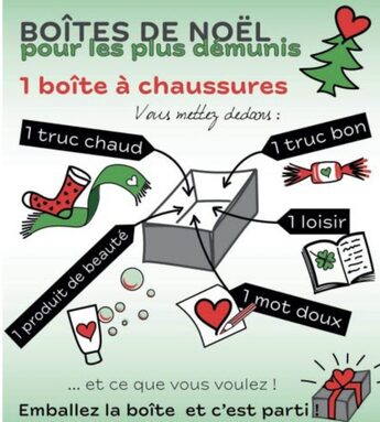 Nous faisons appel à votre générosité pour constituer des" Boîtes de Noël" au profit du Secours Populaire . Ces cadeaux apporteront un peu de chaleur et de réconfort aux personnes qui en ont besoin .